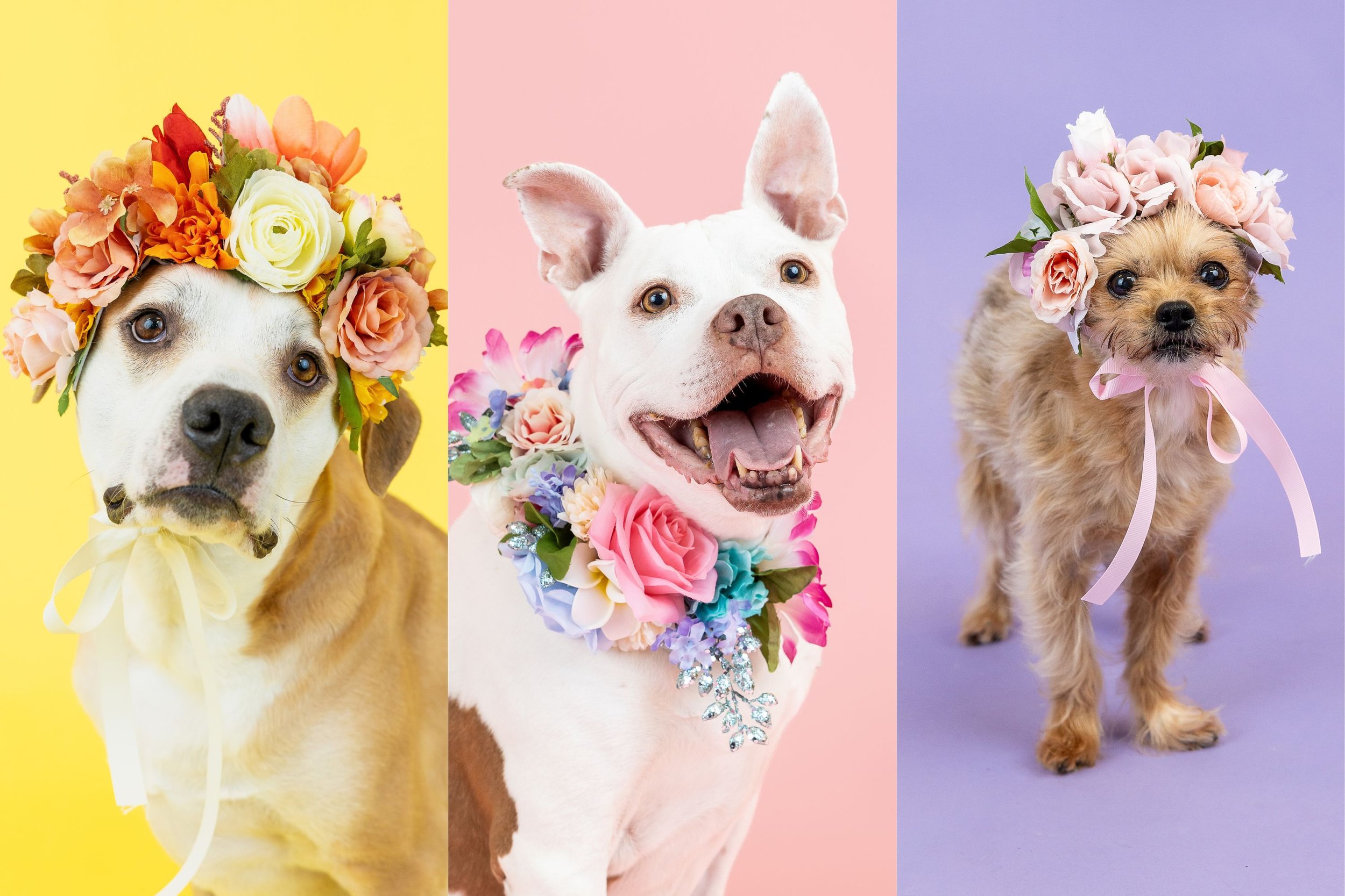 A one-of-a-kind luxury studio experience celebrating your dog adorned in handcrafted flower crowns or collars, set against vibrant spring backdrops.