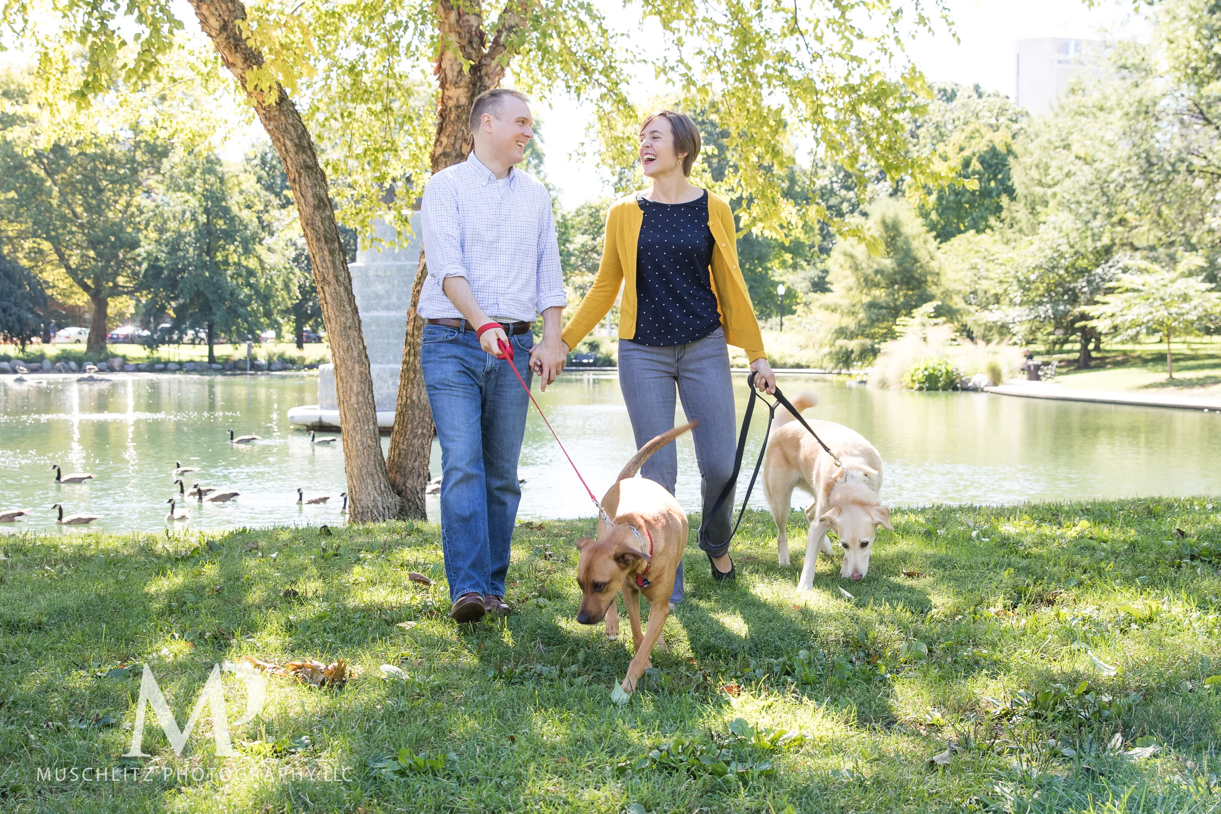 A couple walks their dogs in front of the pond and Elephant Fountain at Goodale Park.